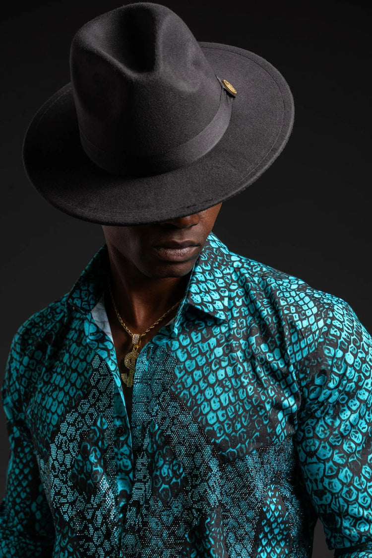 Sophisticated, long-sleeved dress shirt that boasts a luxurious black fabric adorned with an intricate white paisley and floral print. The design exudes a classic charm with a hint of baroque flair, featuring a standard collar and a full-length button placket that ensures a seamless...- $99.99 USD