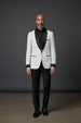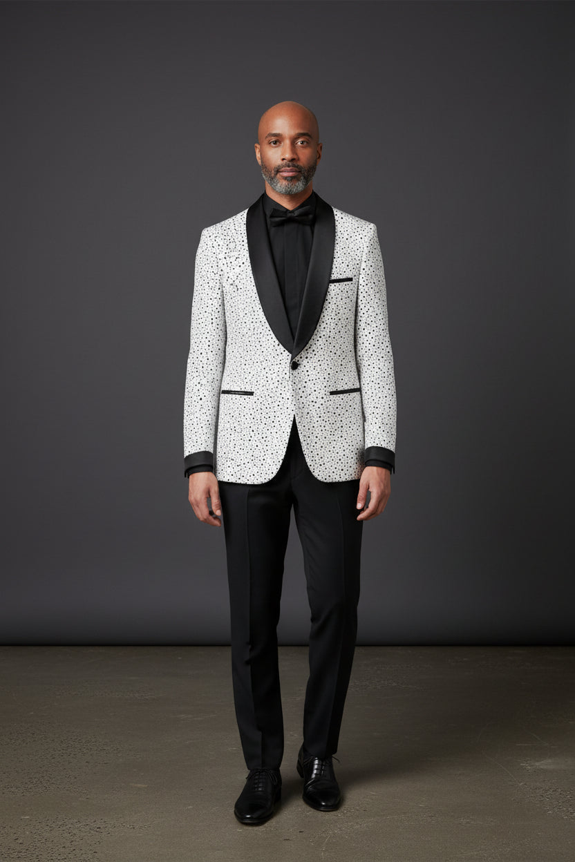 The black polka dot pattern on white fabric with that smooth black velvet shawl lapel? Super clean and sharp. It kind of hits that sweet spot between fun and formal — definitely has a playful confidence to it.