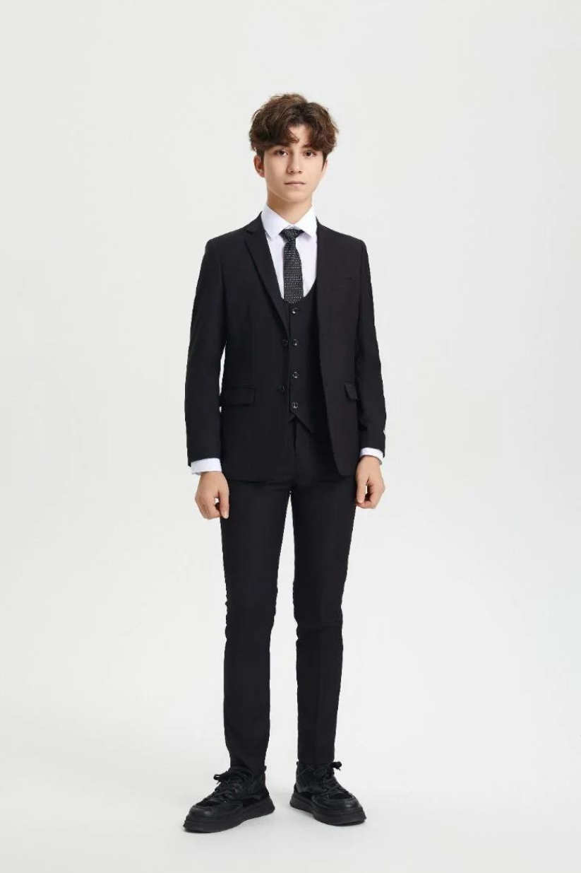 A timeless black suit featuring a single-breasted jacket with a notch lapel, paired with a crisp white shirt and a black tie with subtle polka dots. It is complemented by flat-front trousers and is ideal for formal events.