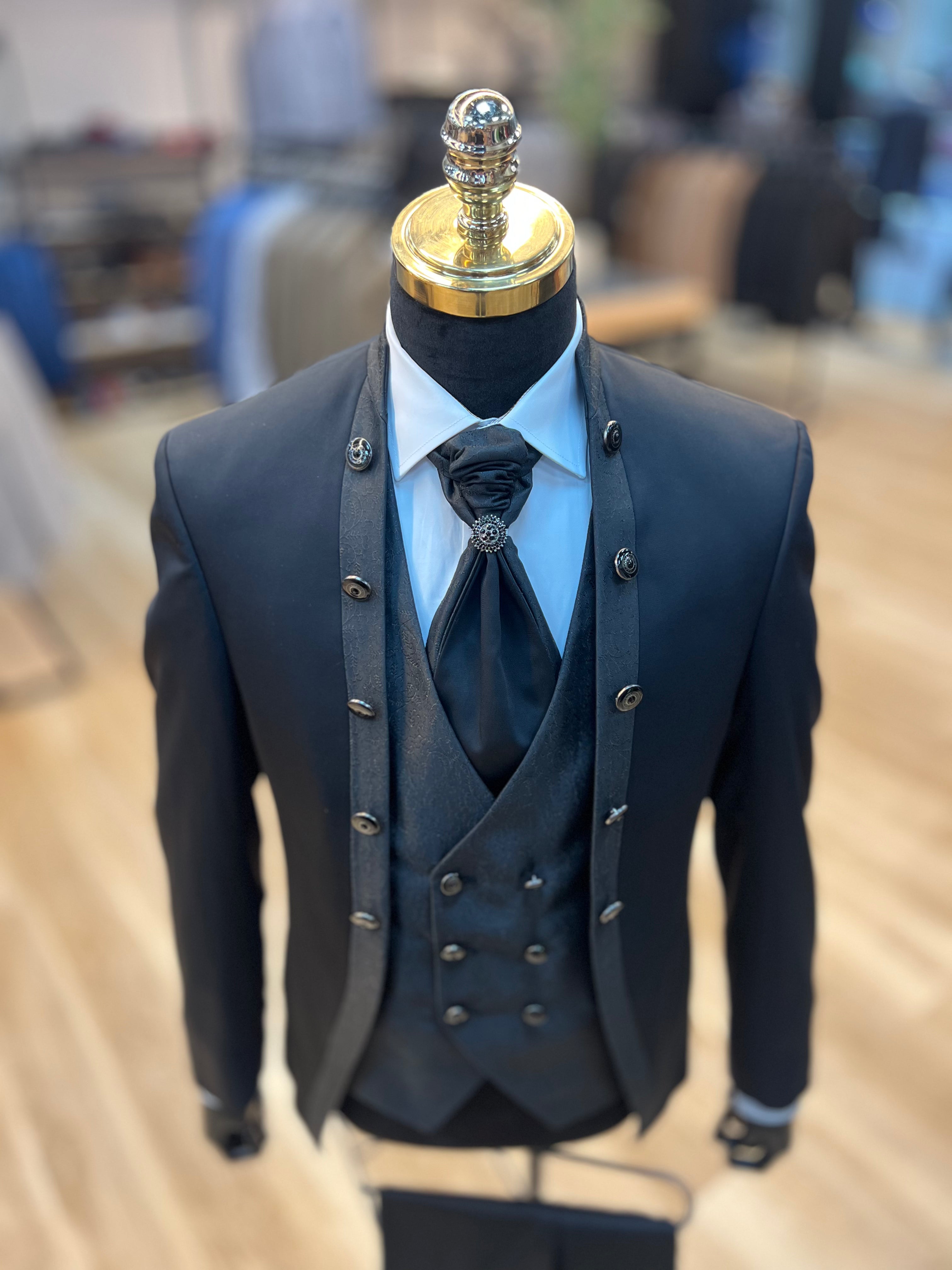 This traditional black tuxedo exudes timeless sophistication with its modern and slim fit. The vest's intricate pattern adds a touch of elegance, while the jacket's 10 lineal buttons and collarless design add a sleek and stylish touch. Elevate your formal attire with this classic piece.