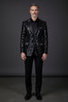 This show-stopping piece features premium textured fabric adorned with intricate hand-embellished sequin and bead embroidery. Each blazer showcases flowing patterns with metallic accents that catch the light from every angle. The structured silhouette is elevated by sleek satin-finish peak lapels, a double-button front closure, and refined flap pockets for a sophisticated edge.