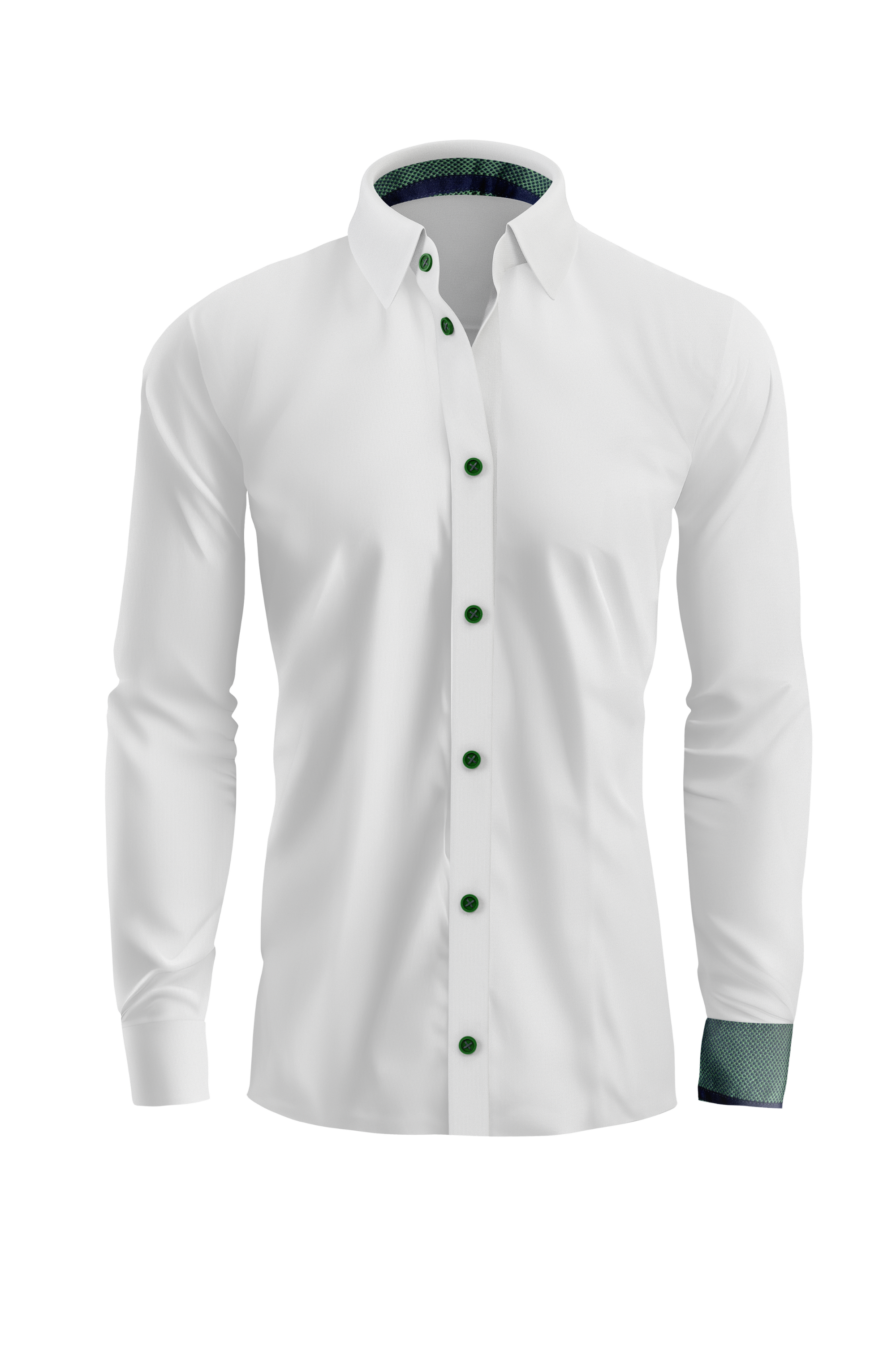 This Contemporary White Dress Shirt blends classic style with a touch of the unique, featuring a subtle yet striking patterned cuff detail. The shirt’s crisp, clean white fabric offers a smooth canvas for any tie or suit pairing, while the contrast provided by the distinctive cuffs adds a modern flair. Perfectly suited for both business and social settings, this shirt is designed to impress with its sharp tailoring and fresh aesthetic.