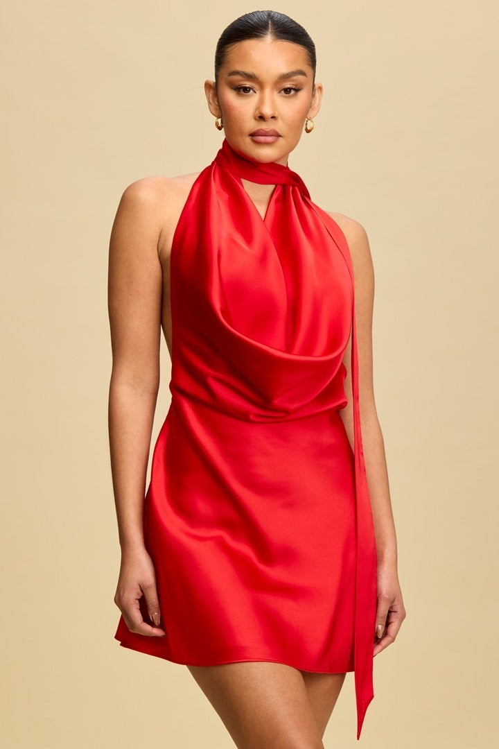 A luxurious satin fabric with a soft, lustrous sheen dramatic cowl neckline that drapes elegantly across the chest halter-style neck tie that adds sophistication and elongates the silhouette .A sleek, body-skimming fit with an asymmetrical sash detail for a touch of modern flair.