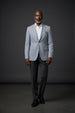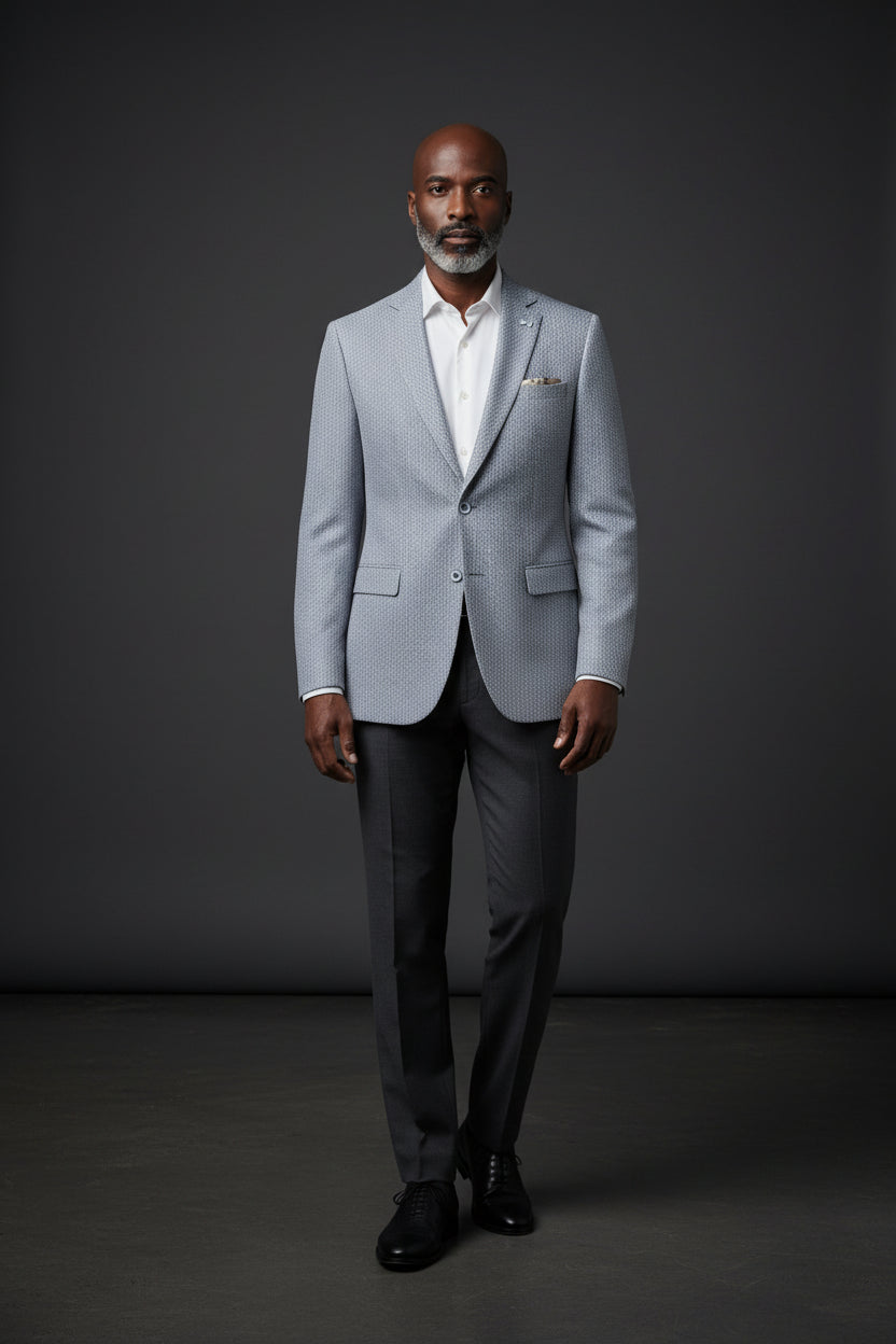 This blazer has a refined and modern look with a subtle geometric pattern in shades of light grey and white, giving it a textured appearance. It features: