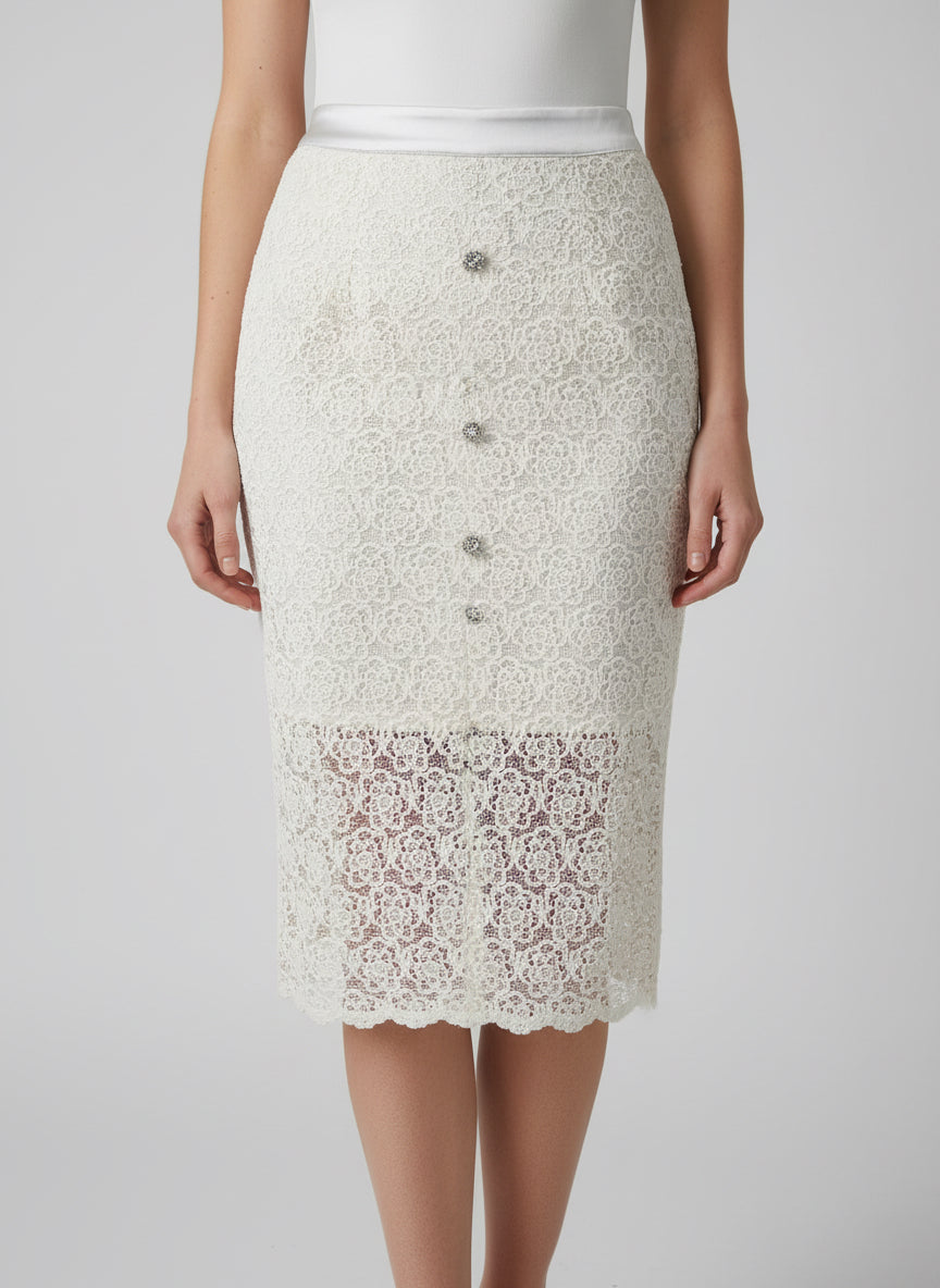 This is a sophisticated high-waisted lace skirt in an ivory or off-white tone. It features an all-over floral lace overlay with a delicate, textured pattern. The front is adorned with a row of ornate, gold-accented buttons matching the blouse from the previous image, giving the piece a vintage-chic finish. Ideal for an elegant set when paired with the matching lace top.