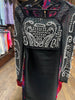 This black dress with pearl and rhinestone embellishments is bold and sophisticated. The intricate detailing on the bodice and sleeves creates an ornate, regal look, making it perfect for a glamorous event or a high-fashion evening out. The contrast between the structured embellishments and the sleek black fabric adds depth and drama, making this dress a true statement piece.