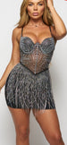 This is a stunning black mini dress featuring a structured, embellished bustier-style top with intricate rhinestone and beaded detailing. The sheer midsection adds a bold and alluring touch, while the beaded fringe skirt creates dynamic movement and a glamorous, eye-catching effect. Perfect for a night out, special event, or party, this dress is designed to make a statement with its dazzling embellishments and figure-hugging silhouette.