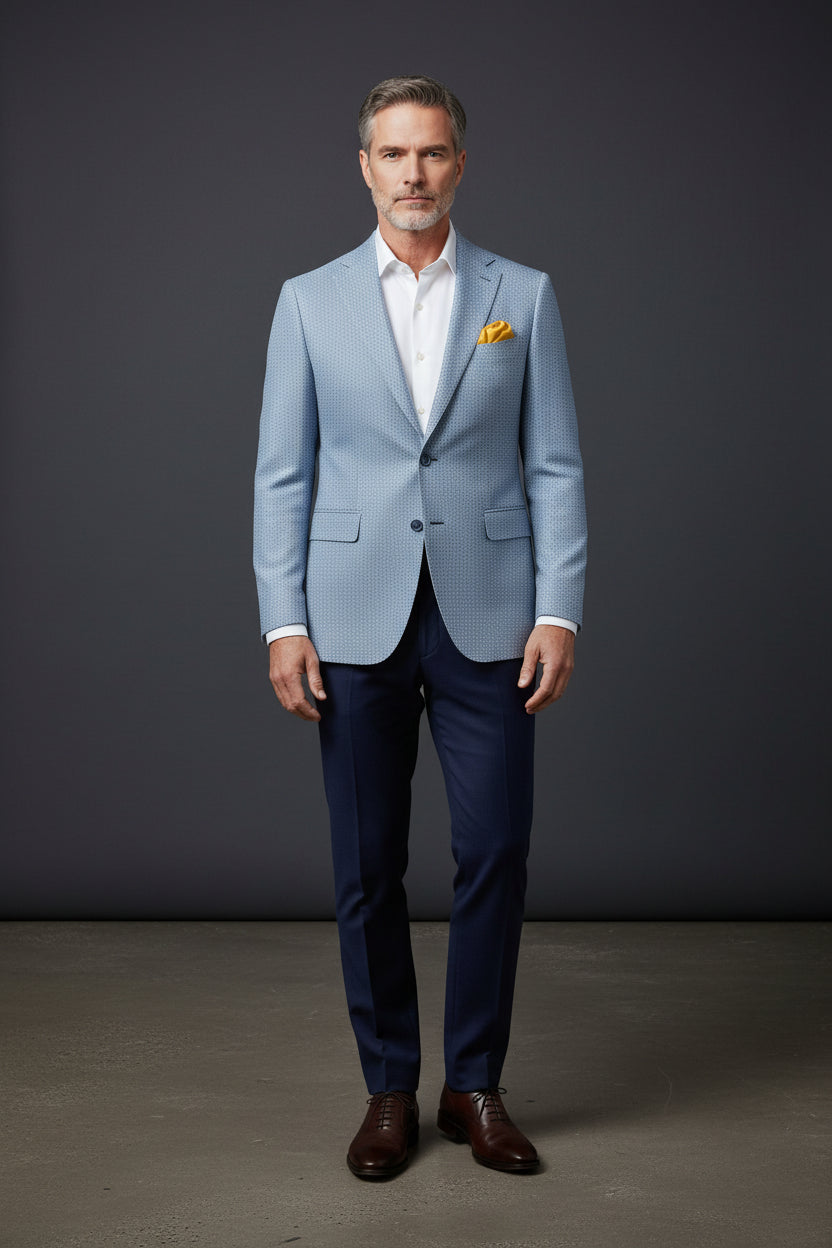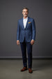 A masterfully tailored blazer that commands attention with its sophisticated geometric plaid pattern in rich sapphire blue and warm brown tones. This statement piece seamlessly transitions from boardroom to evening events, embodying the modern gentleman's versatility.