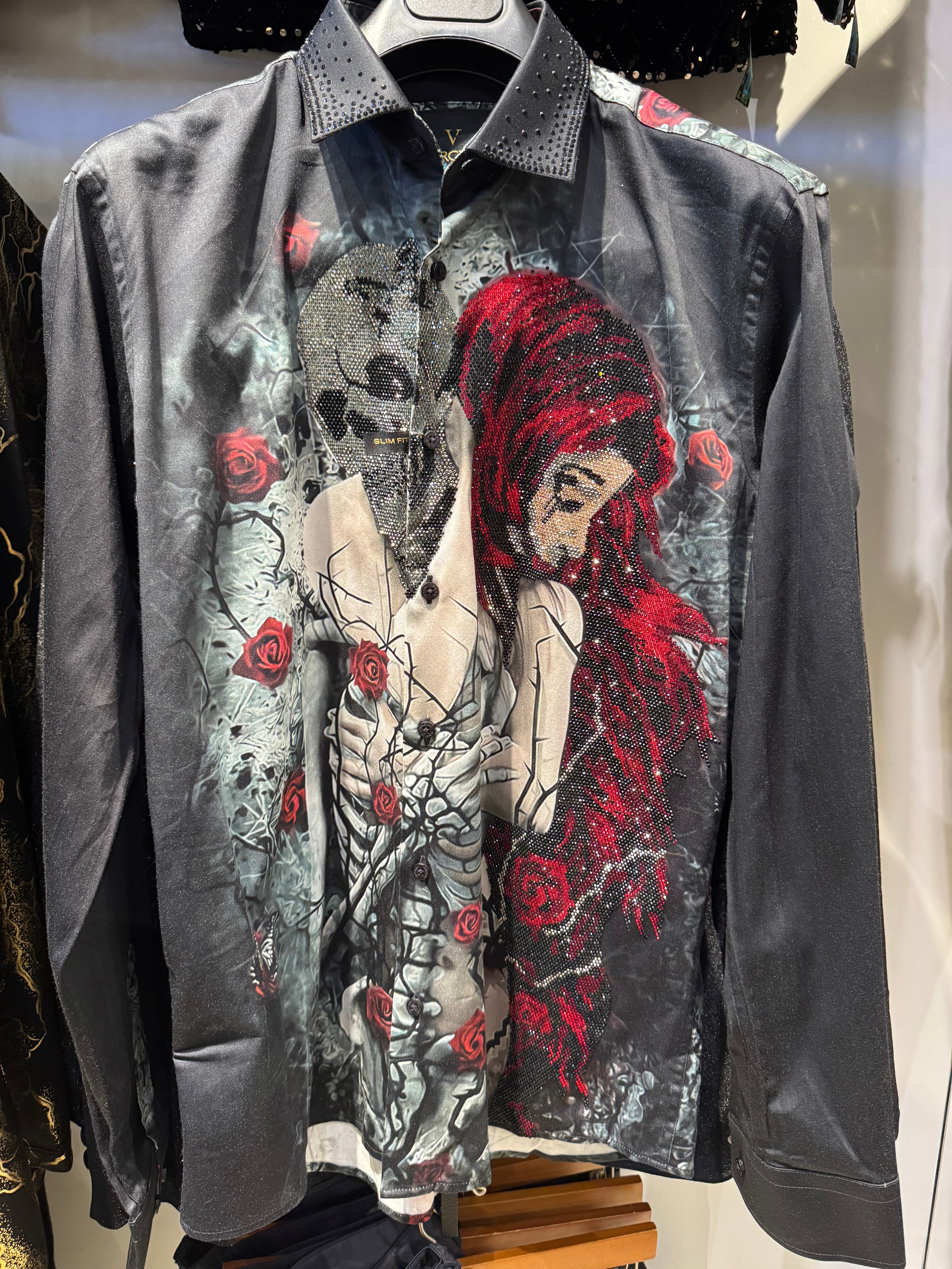 THIS EDGY AND ARTISTIC SHIRT IS BOLD FASHION STAEMENT FEATURING A STRIKING GRAPHIC DESIGN OF SKELETAL FIGURE EMBRACED WITH A WOMAN,ACCENTED BY VIBRANT RED ROSES AND INTRICATE DETAILS.THE COLLAR IS ADORNED WITH STUD EMBELLISHMENTS,ADDING A TOUCH OF ROCK-INSPIRED SOPHISTICATION.CRAFTED FOR THOSE WHO DARE TO STAND OUT, THIS SHIRT COMBINES GOTHIC ARTISTY WITH CONTEMPORARY FASHION.PERFECT FOR CASUAL OUTINGS,THEMED EVENTS,OR MAKING A MEMORABLE IMPRESSION.