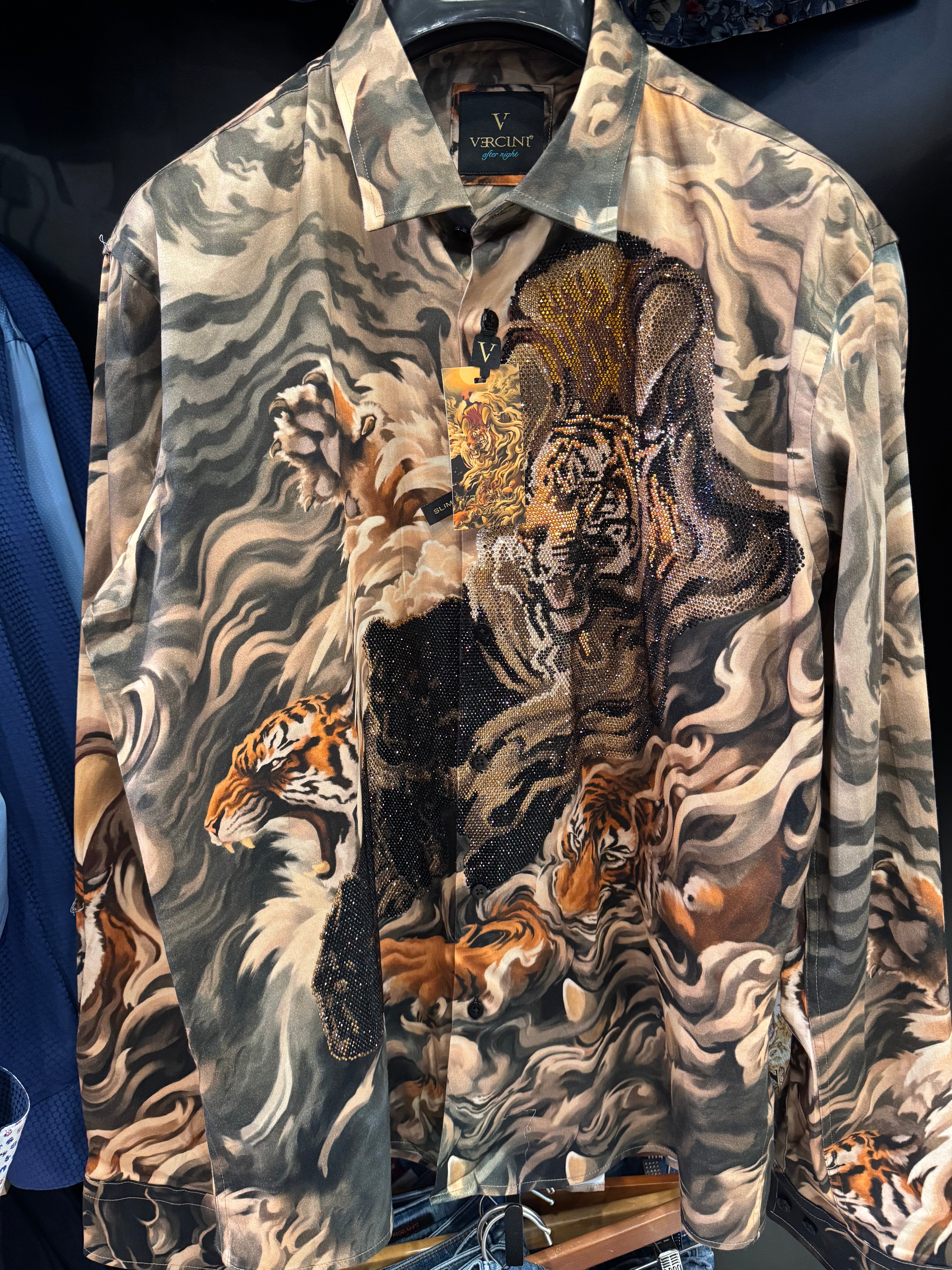 This shirt features a dramatic and artistic design, dominated by a swirling, smoky background in neutral tones of beige, grey, and black. The main highlights are the detailed tiger motifs, rendered with dynamic realism and integrated into the swirling patterns, giving a sense of movement and intensity. One tiger is emphasized with sparkling rhinestone embellishments, adding a touch of luxury and a bold statement to the overall look. The shirt, branded by “VERCINI” is tailored for those who want to stand out with an exotic, powerful, and fashion-forward aesthetic.