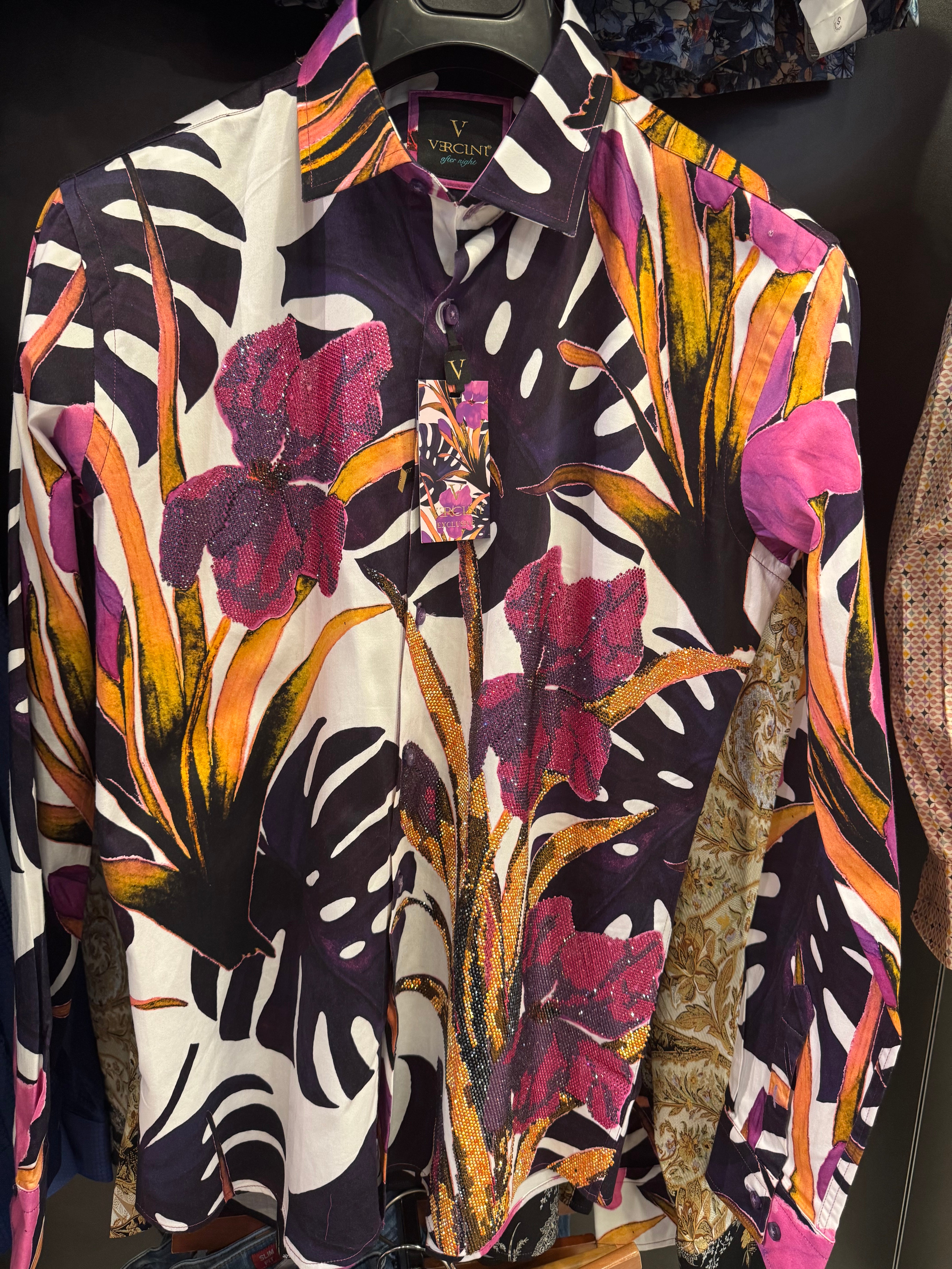 This vibrant shirt is a tropical masterpiece, showcasing a bold and dynamic design of lush purple flowers, golden leaves, and striking black-and-white abstract patterns. The colorful mix of deep purple, gold, and white creates a captivating contrast, making this shirt perfect for those who want to stand out in style. Crafted for a modern fit, it’s ideal for festive occasions, casual outings, or resort wear. With its eye-catching design and luxurious feel, this piece adds a touch of tropical elegance to any wardrobe.