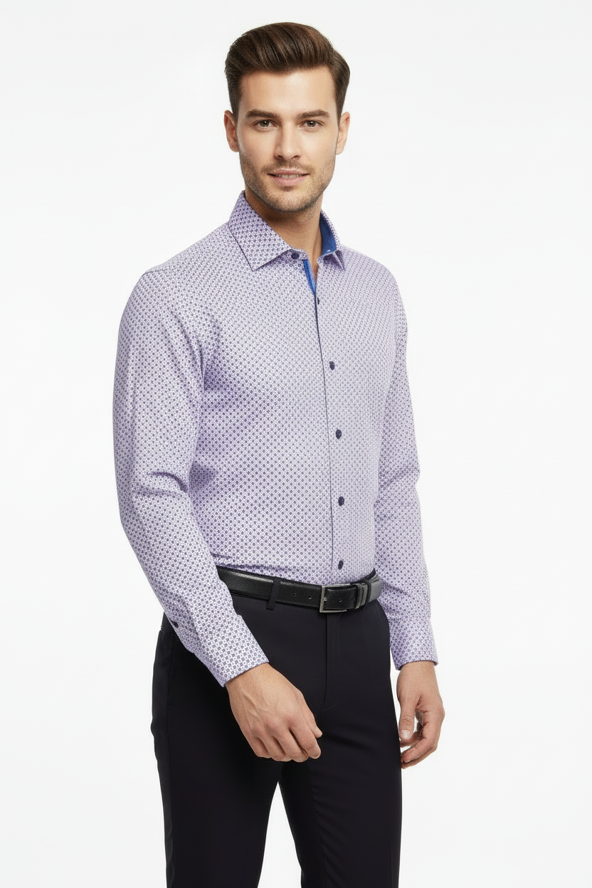 The VECS-Z45 shirt stands out with its striking lilac base and intricate navy geometric pattern, offering a bold yet refined look. Designed from a smooth, breathable cotton-blend fabric, it ensures comfort while maintaining structure and shape. The inner collar and placket feature a clean blue trim, harmonizing with the rich blue buttons for a polished finish. Ideal for both business-casual and evening wear, this shirt adds a confident, fashion-forward edge to any outfit