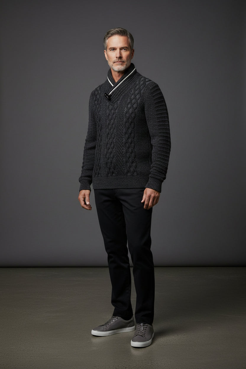 Elevate your cold-weather style with the Vercini CROWNED Shawl Sweater. Crafted from a richly textured knit, this sweater features a refined shawl collar with a modern wrap design and dual buckle detail for a distinctive, upscale look. The tailored silhouette offers a clean, masculine fit, while the ribbed cuffs and hem provide structure and comfort. Perfect for layering or wearing on its own, this piece transitions effortlessly from casual evenings to smart-casual occasions, delivering warmth, style, and unmistakable Vercini sophistication.