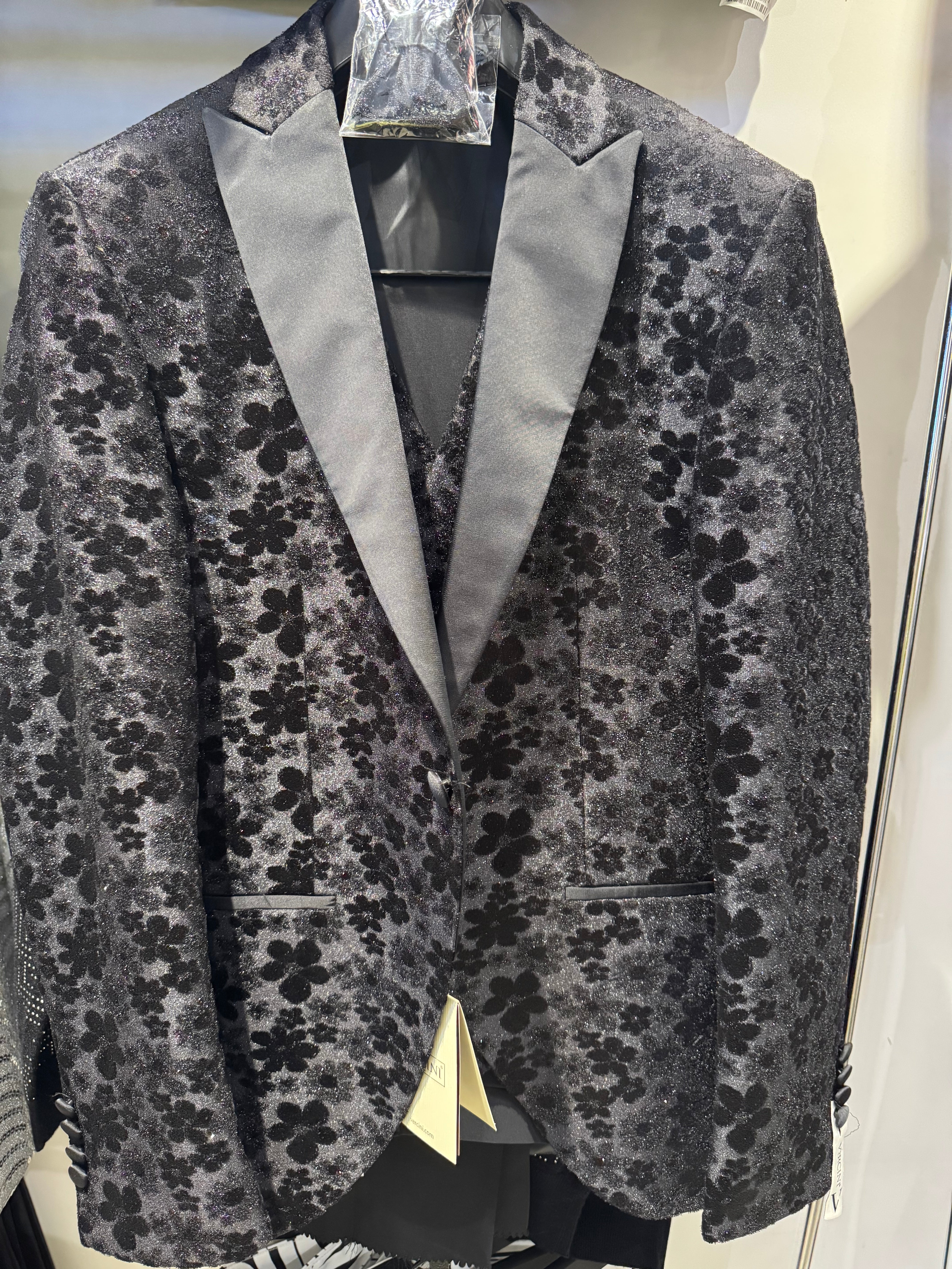 Step into sophistication with our Vercini Floral Elegance Tuxedo, designed for the modern gentleman who dares to stand out. This stunning blazer features a luxurious black and silver floral jacquard fabric, creating a shimmering effect that exudes confidence and refinement.