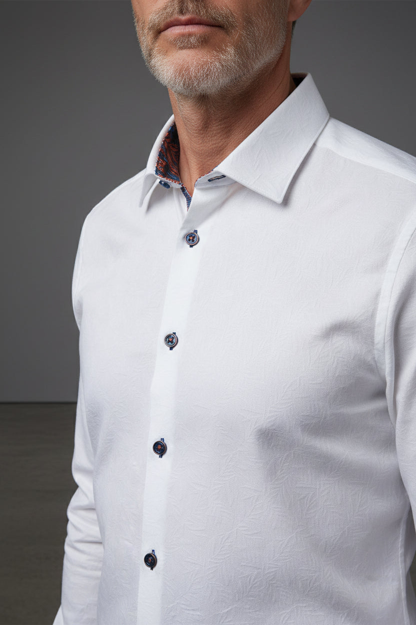 Elevate your formalwear with this impeccably tailored white dress shirt. Crafted from premium fabric, this piece features refined contrast cuffs that add a sophisticated detail to the classic silhouette. The crisp white finish and precise tailoring make it an essential foundation for any luxury wardrobe.