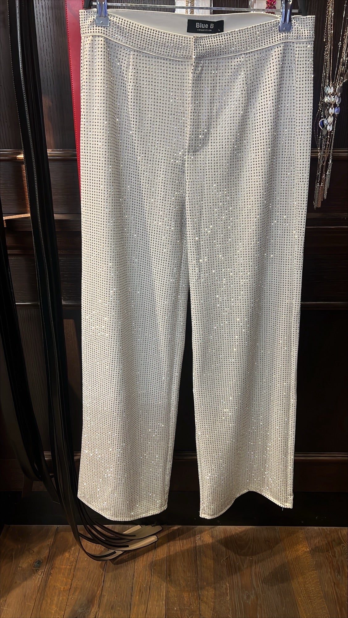 These are glamorous white rhinestone-studded wide-leg pants that exude luxury and sophistication. The high-waisted silhouette offers a flattering fit, while the shimmering embellishments add a bold, statement-making appeal. The tailored yet relaxed cut allows for effortless movement, making them perfect for a night out, special occasions, or an elevated street-style look. Pair them with a matching embellished jacket or a sleek top for a show-stopping ensemble.